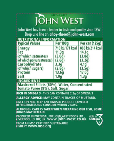 John West Mackerel Fillets in Tomato Sauce Pack of 10x125g