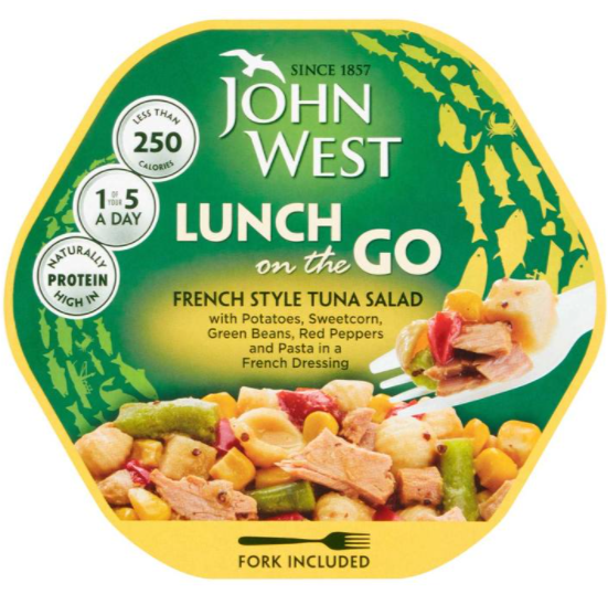 John West Lunch On The Go contains 6 handy foil sealed packs with a fork included so you can graba convenient. tasty lunch on the go.