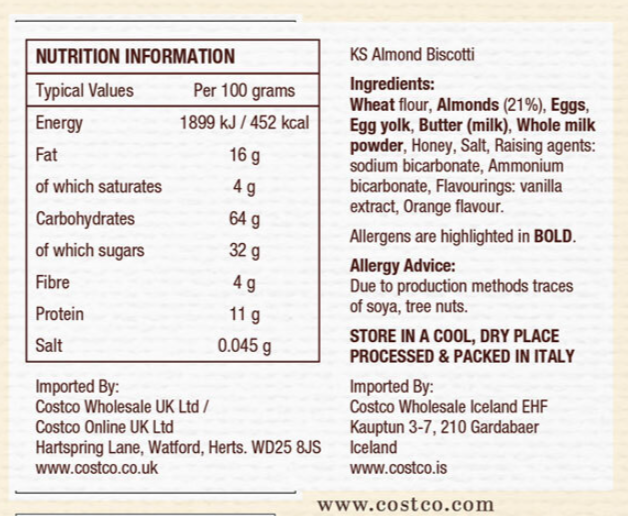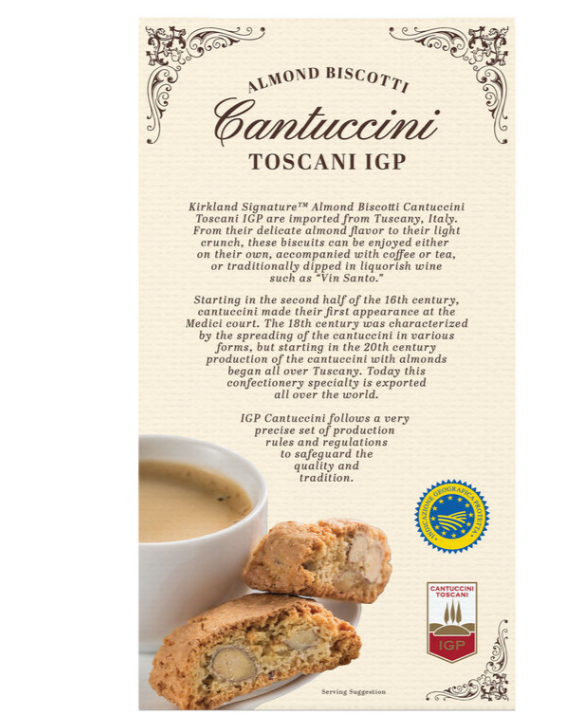 Kirkland Signature Cantuccini Toscani IGP Almond Biscotti are imported from Tuscany. Italy. From their delicate almond flavour to their light crunch. these biscuits can be enjoyed either on their own. accompanied with coffee or tea. or traditionally dipped in liquorish wine such as ”Vin Santo”. These biscuits are made using cage-free eggs. 21% almonds and millefiori honey for a delicious and moreish taste.