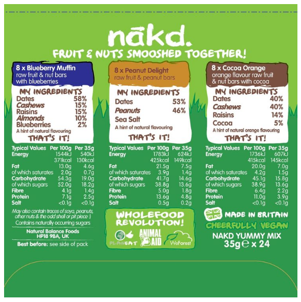 Nakd’s delicious Yummy Mix includes a variety of chocolatey. cakey and nutty fruit and nut bars – there’s something for everyone! Featuring Blueberry Muffin. Cocoa Orange and Peanut Delight you’ve found yoursnacking soul mate with this mixed case.