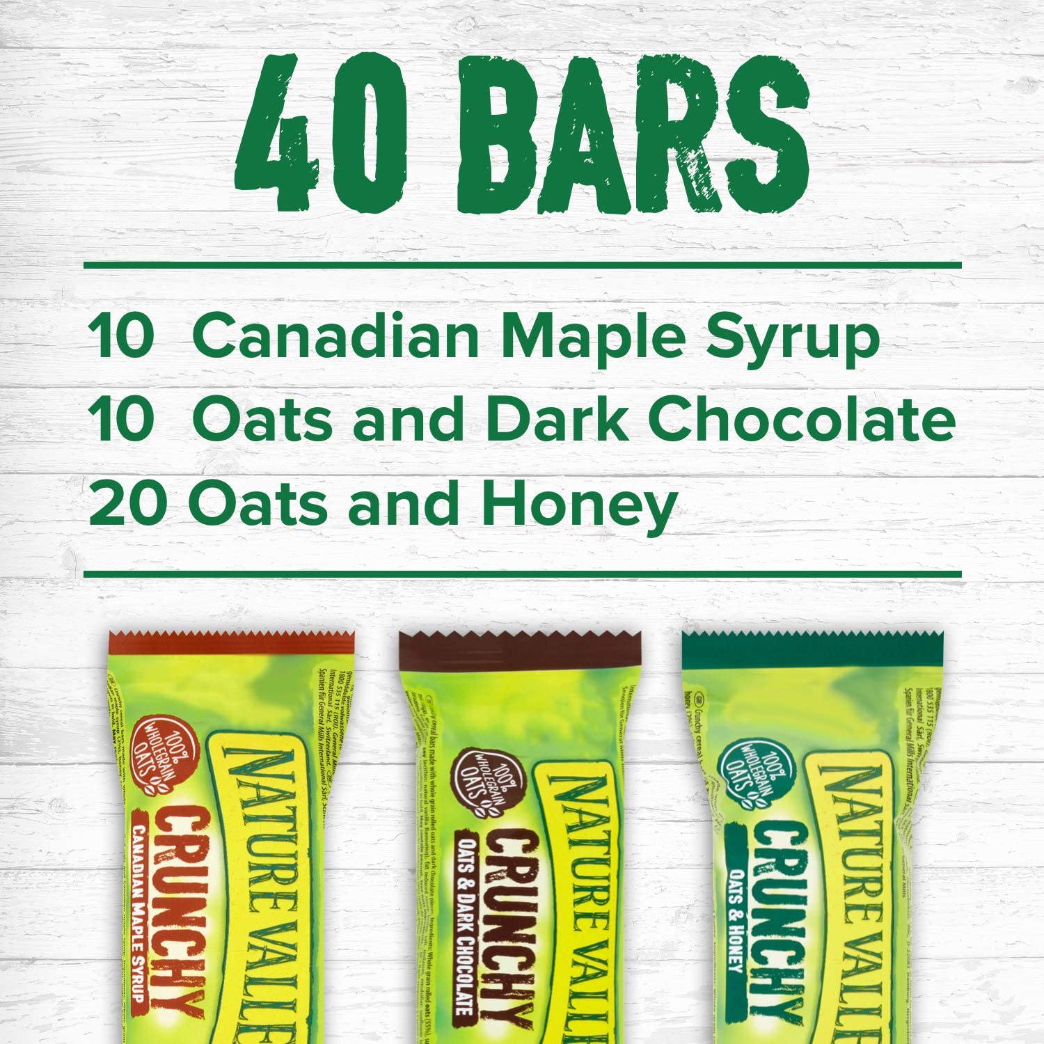 Nature Valley Crunchy cereal bars are made with wholegrain rolled oats. Variety pack includes Canadian Maple Syrup. Oats & Dark Chocolate and Oats & Honey.