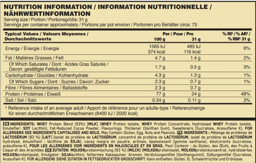 Optimum Nutrition Gold Standard Chocolate 100% Whey delivers 24g of whey protein to support muscle growth with a delicious double rich chocolate flavour. After training. your body uses protein to help repair and rebuild muscle fibres. Each great tasting serving contains 24g of premium whey protein to support muscle growth and 5.5g of naturally occurring BCAAs; all with just 1g of fat and 1.2g of sugars.