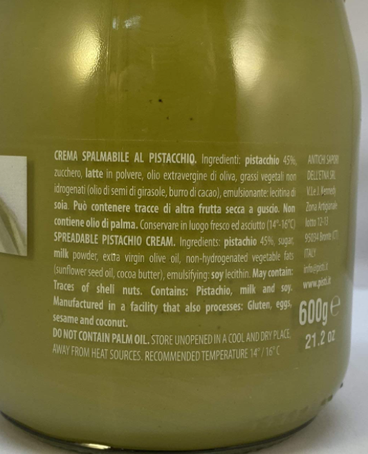 Pistachio 45%. sugar. milk . extra virgin olive oil. non-hydrogenated vegetable fats (sunflower oil. cocoa butter). emulsifier: soy lecithin . May contain other nuts.