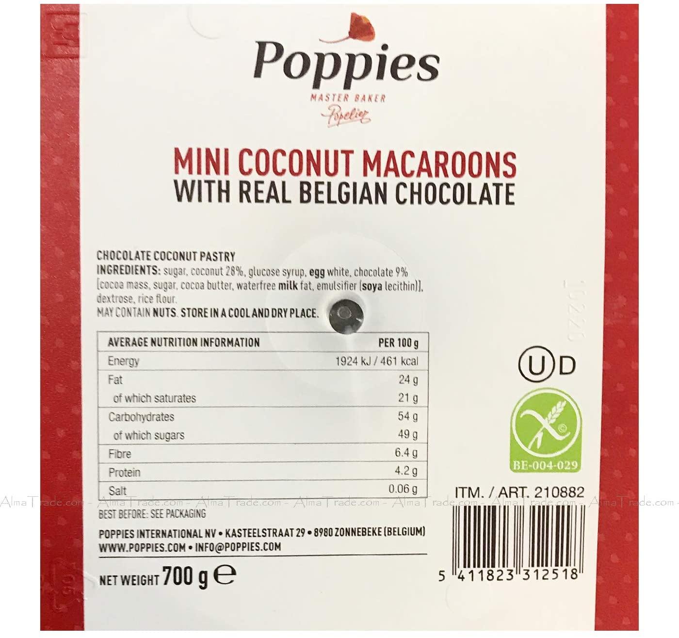 Poppies have been passionate about delighting you with gourmet cookies. pastries and desserts ever since 1935. Selecting the best quality ingredients and guaranteeing the ultimate freshness are what make Poppies delicacies enjoyed by people all over the world. Poppies Mini Coconut Macaroons With Real Belgian Chocolate offer a delightful touch of coconut sweetness which are completely irresistible.