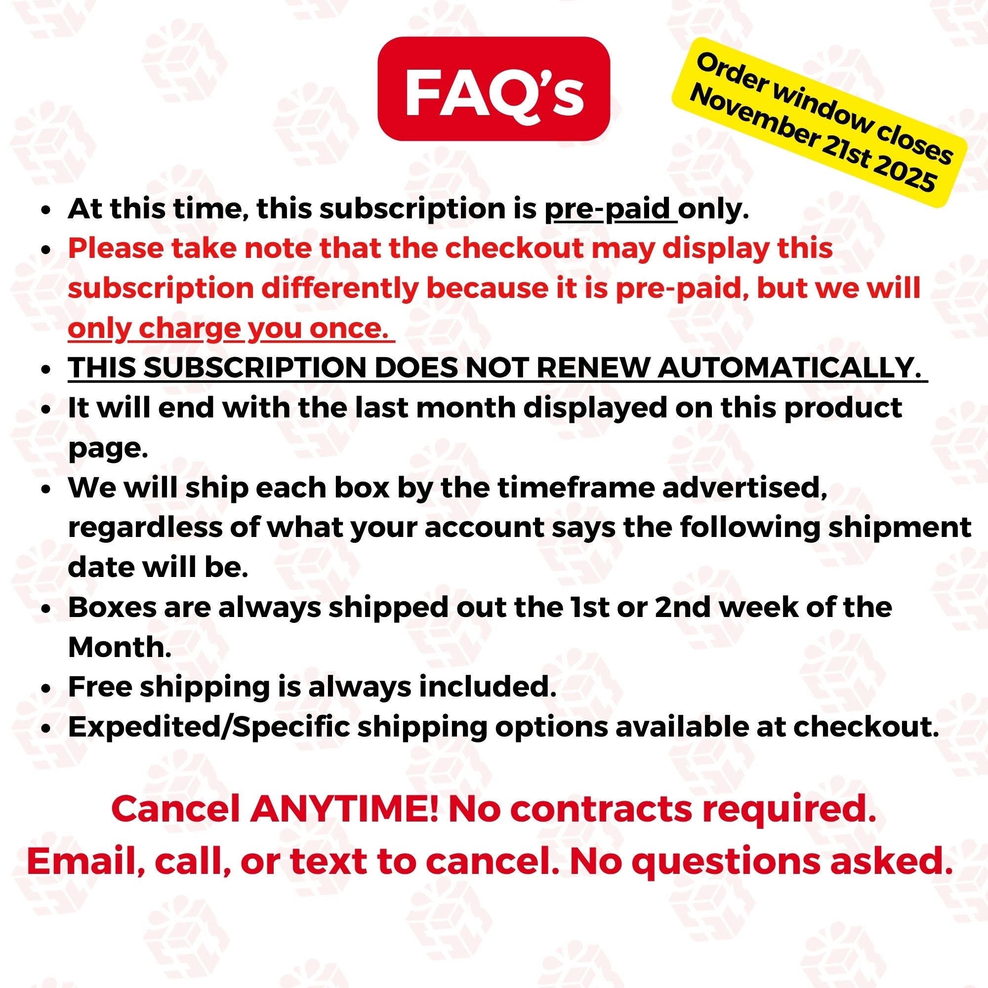 • Boxes are always shipped out the 1st or 2nd week of the Month.