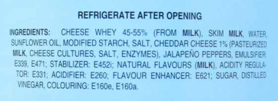 WHEY product (from milk). skimmed MILK. water. sunflower oil. modified starch. salt. cheddar CHEESE (pasteurized MILK. CHEESE cultures. salt. enzymes). jalapèno peppers. emulsifier (E339. E471. E452i. natural flavors (MILK). acidity regulator ( E331. E260). flavor enhancer (E621). sugar. brandy vinegar. color (E160e. E160a).