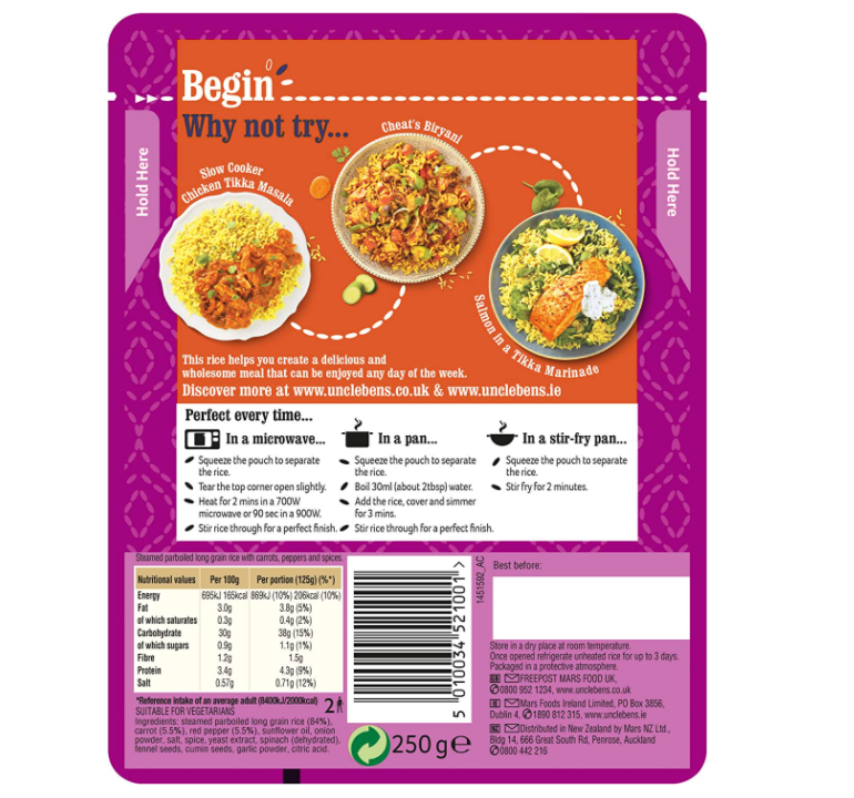 Steamed Parboiled Long Grain Rice (84%) Carrot (5.5%) Red Pepper (5.5%) Sunflower Oil Onion Powder Salt Spice Yeast Extract Spinach (Dehydrated) Fennel Seeds Cumin Seeds Garlic Powder Citric Acid